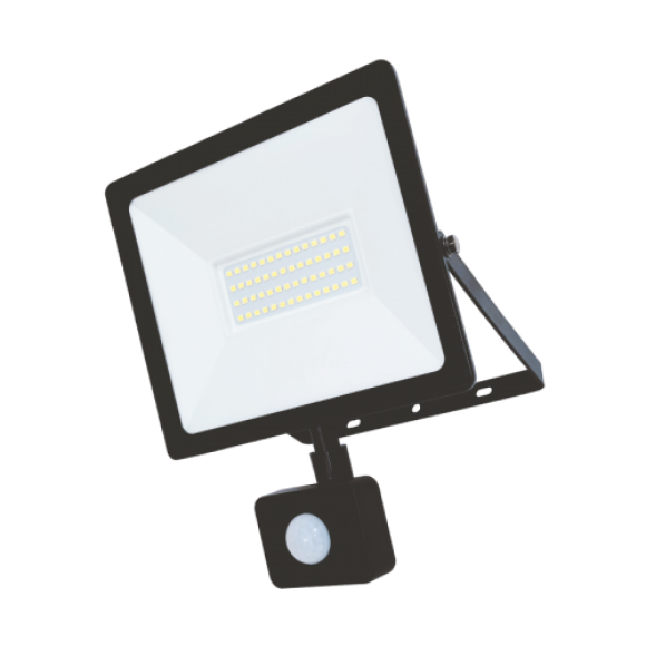 LED prožektors ar simetrisku matricu sadalījumu kvalitatīvākai gaismas radīšanai. Korpusa izturība IP65, IK05. Liets alumīnija korpuss (AS9U) pārklāts ar augstas kvalitātes pūlverkrāsas pārklājumu (RAL 9005). Difuzors - Stikls. Gaismas temperatūra 4000K, gaismas plūsma 9000lm. LED prožektors in nokomplektēts ar PIR sensoru. Darbības leņķis 180 °, maksimālais darbības attālums 10m no sensora. Prožektora izmēri 29,5x25cm.